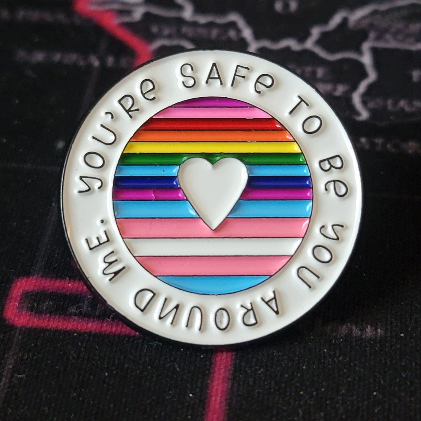 - Exquisite Design: This pin is a small yet eye-catching accessory, featuring a round pattern with white and colorful elements. The words "You're safe to be you around me" encircle the edge, offering a warm and reassuring message that exudes comfort and tranquility